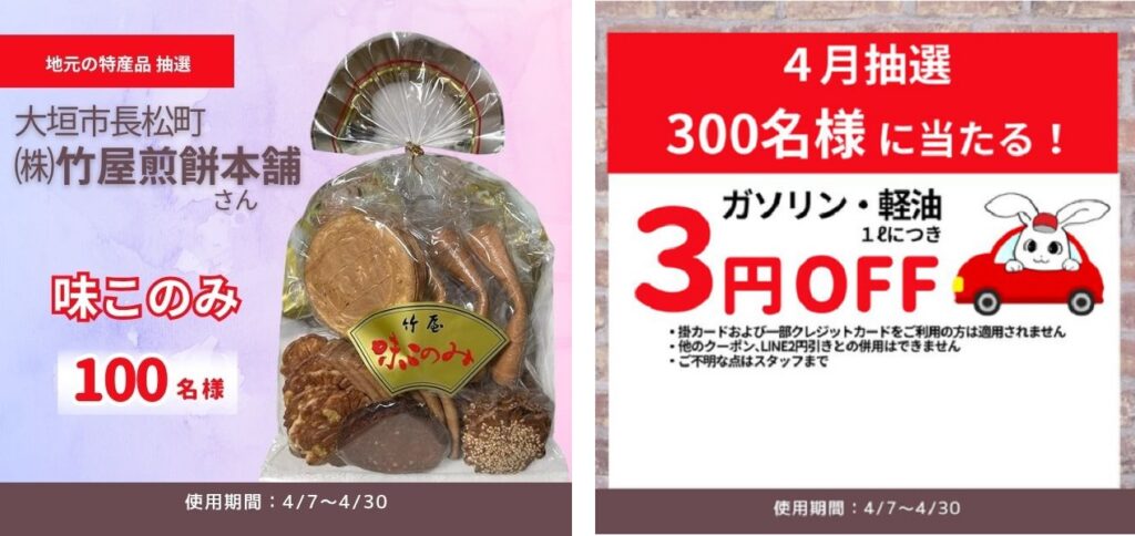 毎月7日はLINE友だち限定、地元の特産品やガソリン・軽油の割引券が当たるお得な抽選会を実施しています。4月の地元の特産品は、株式会社竹屋煎餅本舗(長松町)さんの「味このみ」を100名様にプレゼントします。ガソリン・軽油 3円引券は300名様に当たります。